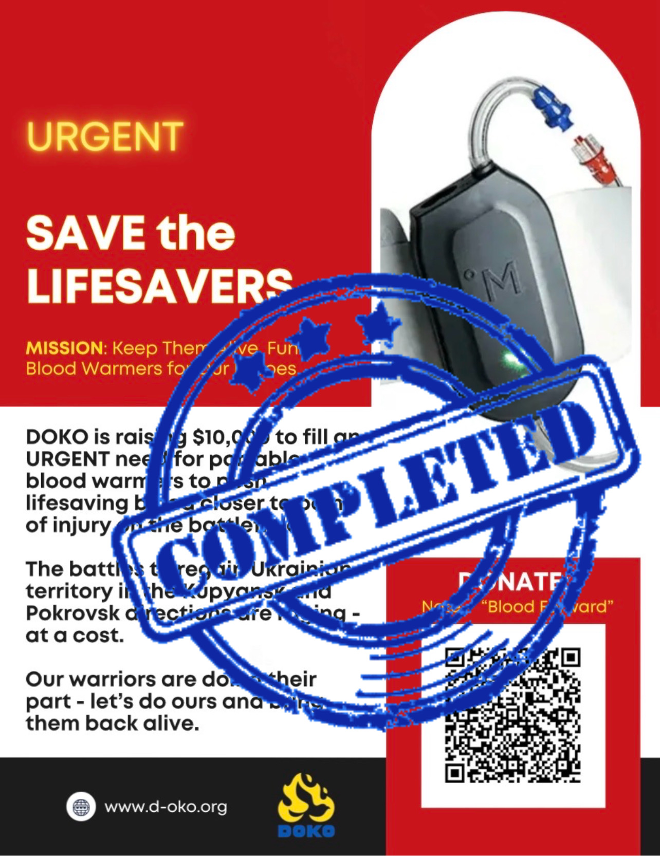 Giving Tuesday: DOKO is raising $250,000 to complete Phase 2 equipment rollout with additional Special Forces partners by year end. Help us provide portable blood transfusion equipment and the best vehicles for evacuating under fire. Make a donation to save the life of a brave Ukrainian warrior today.